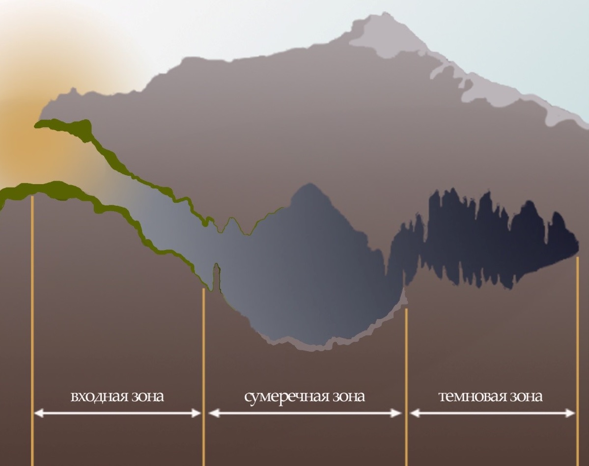 В пещерах выделяют три зоны: входную, сумеречную и глубинную (deeper zone, deep cave – в англоязычной литературе). Данная классификация основывается, прежде всего, на световом факторе (Poulson, White, 1969; Northup, Lavoie, 2001). Во входную зону проникает солнечный свет, интенсивность которого зависит от дневного светового цикла. В сумеречную зону попадает частично прямой или отраженный солнечный свет. В глубинную зону свет не проникает (рис. 1).