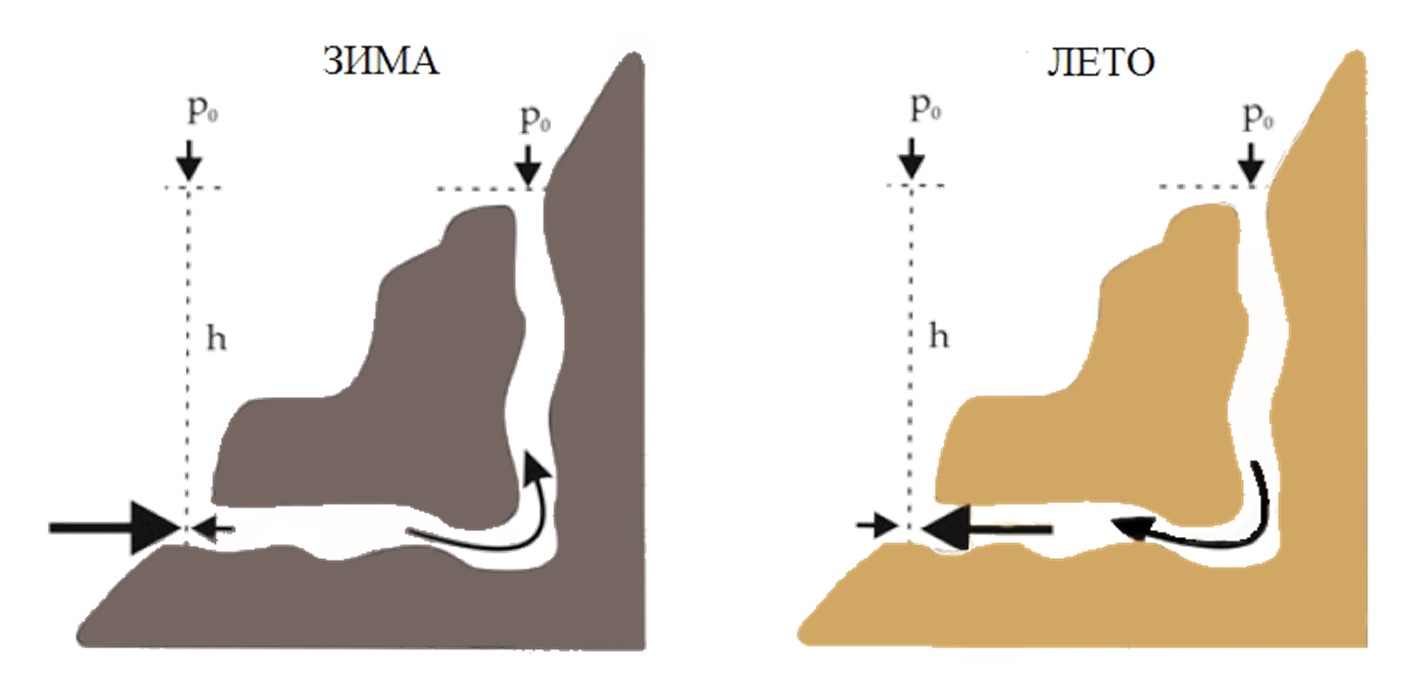 Рис. 2. Принцип движения воздуха на примере упрощенной модели пещеры (по материалам Lauritzen, 2018)