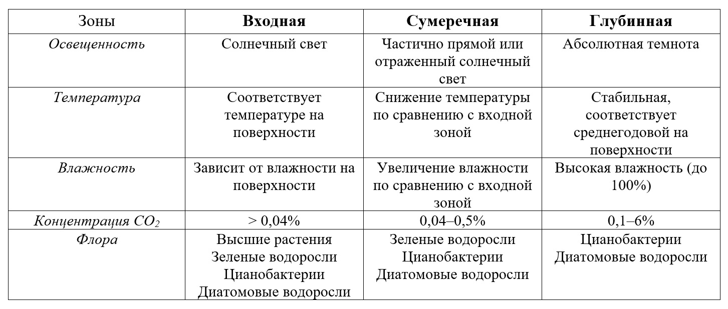 Для каждой зоны характерны специфические физико-химические условия: наличие источников освещения, температура, влажность, доступность воды, пористость и проницаемость субстрата, газовый состав атмосферы (табл. 1). Это влияет на потенциал колонизации и распространение живых организмов внутри пещеры (Bonacci et al., 2009).