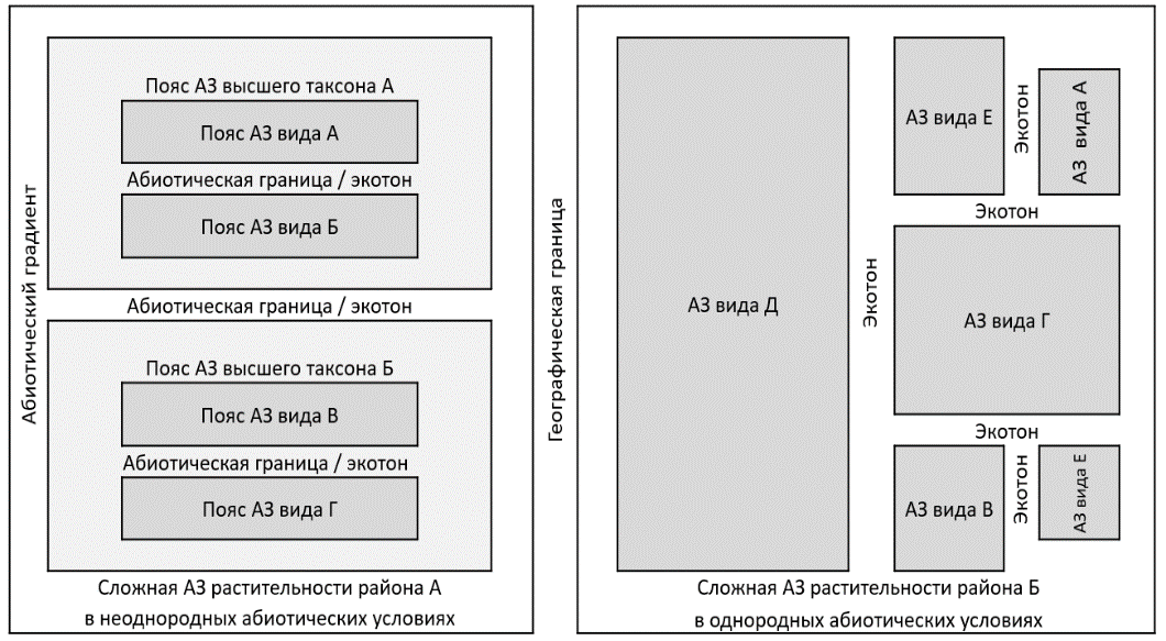 Биологически адекватное описание донной морской растительности требует наличия общей концепции, которая объясняла бы наблюдаемый характер распределения макрофитобентоса. Для морской растительности умеренных и высоких широт типично формирование поселений, в которых структура сообщества определяется единственным видом, в то время как обилие прочих оказывается существенно ниже (Скарлато и др., 1967; Огородников, 2003; Селиванова, 2004; Taniguti, 1962; den Hartog, 2016 и др.). Такая структура соответствует концепции адаптивной зоны (Симпсон, 1948; Волвенко, 2018; Volvenko, 2022). Ее формирование обусловлено комплексом адаптаций некоторых организмов к условиям среды, обеспечивающих им наибольший успех в размножении (по: Симпсон, 1948). Адаптивные зоны разделены относительно выраженными границами и преобладают в модельных районах (Дуленин, 2023, 2024б). Узкие адаптивные зоны отдельных видов слагаются в системы широких зон высших таксонов. Пояса растительности отдельных районов целесообразно рассматривать как сложные адаптивные зоны. Они должны представлять собой систему из соподчиненных ячеек, состоящих из поясов, сложенных представителями высших таксонов и отдельных видов, разделенных экотонами, приходящимися на участки смены экологических условий (рис. 1, слева), либо хаотичную мозаику адаптивных зон отдельных видов (рис. 1, справа) в однородных условиях.