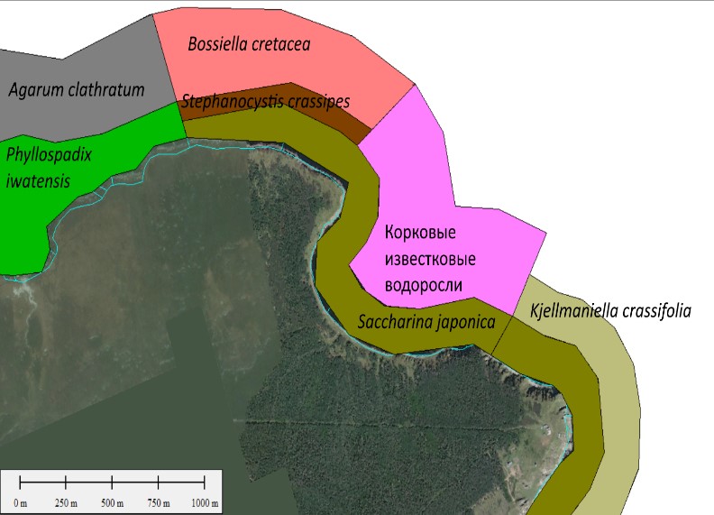 На ландшафтном инфраценотическом уровне выражена поясная структура растительности: выделяется до 5 ценотических поясов, при этом на отдельных разрезах их количество всегда меньше. Вдоль наиболее типичных для района абразионных берегов, ниже клифа, на пологой валунной отмостке бенча с глубинами от 0 до 5–6 м располагаются по 1 или 2 пояса растительности. У самого берега формируются пояса филлоспадикса иватенского, перемежающиеся с поясами сахарины японской, которая к северу от ценотической границы у мыса Сюркум замещается сахариной цикориевидной. На границе склона и валунной отмостки сахарины сменяются поясами представителей сем. Sargassaceae, а еще ниже – поясами агарума продырявленного. На максимальных глубинах пояса образуют членистые и корковые известковые водоросли – представители порядка Corallinales (рис. 10).