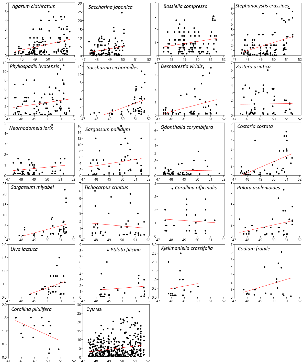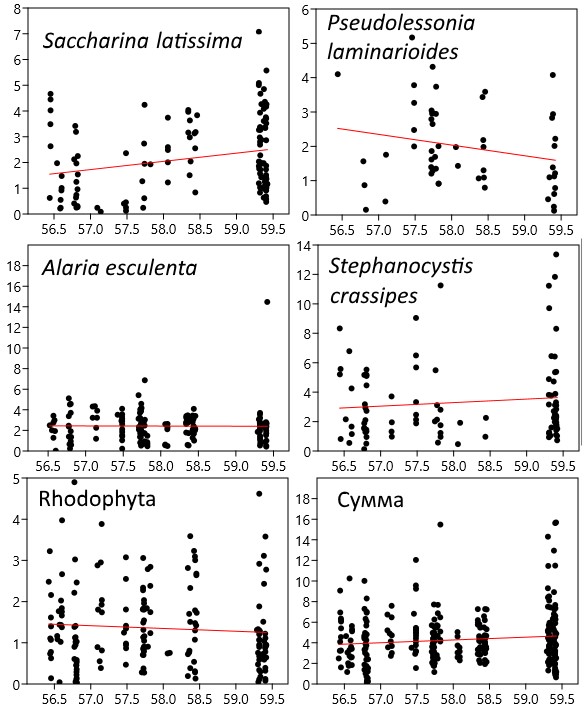 Fig. 8. Distribution of dominant vegetation species specific biomass of along the northwestern Sea of Japan coast by latitude. The abscissa axis shows latitude (degrees), and the ordinate axis shows specific biomass (kg/m2). Regression lines are shown (red lines)