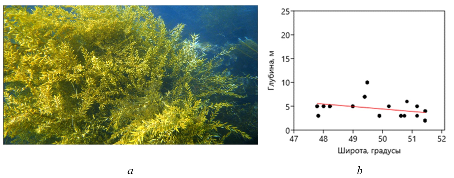 Очевидно, что практическое использование визуальных данных о проективном покрытии возможно при условии, если его можно удовлетворительно пересчитать в биомассу. Было установлено, что в южном модельном районе для промысловых видов зависимость между покрытием и удельной биомассой хорошо выражена (Дуленин, 2016а) и позволяет выполнять такие пересчеты (табл. 2). В северном модельном районе данные о покрытии оказались непригодны для пересчета в биомассу (Дуленин, 2015), поскольку их получали после нереста сельди, когда макрофиты покрыты ее икрой, которая скрадывает имеющиеся зависимости. Поселения сахарины японской – промыслового вида, определяющего облик растительности южного модельного района (рис. 5a), приурочены к доступным для визуальных наблюдений мелководьям, а связь покрытия и биомассы сильно выражена (табл. 2, рис. 5b).