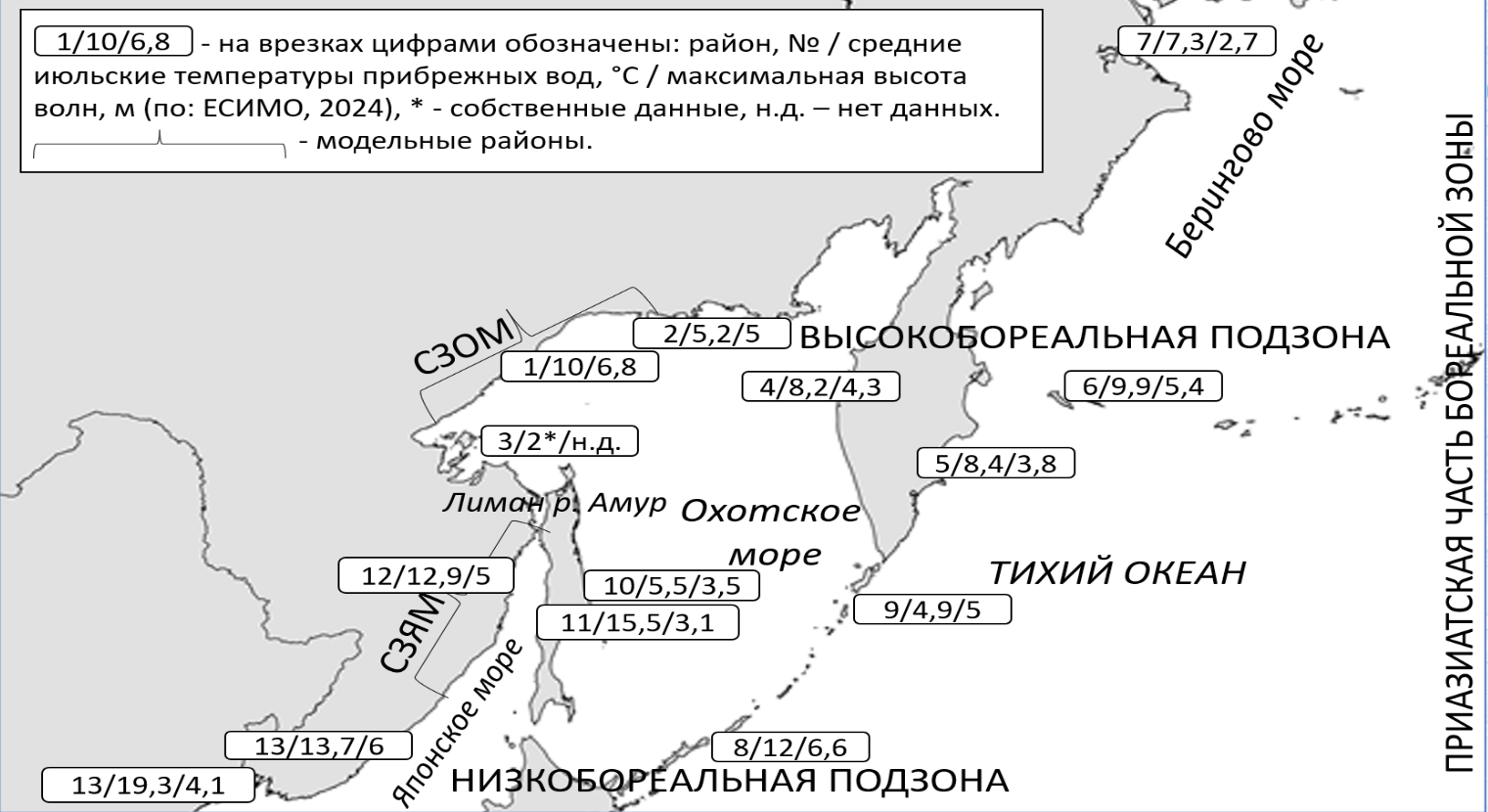 Рис. 2. Фитогеографическое зонирование (по: Перестенко, 1994), районы, температуры и высота волн прибрежных вод морей Дальнего Востока России. Районы: 1 – северо-западное побережье Охотского моря (СЗОМ), 2 – север Охотского моря, 3 – Шантарские острова, 4 – западная Камчатка, 5 – восточная Камчатка, 6 – Командорские острова, 7 – Чукотка, 8 – южные Курильские острова, 9 – северные Курильские острова, 10 – восточный Сахалин, 11 – западный Сахалин, 12 – северо-западное побережье Японского моря (СЗЯМ), 13 – Приморье