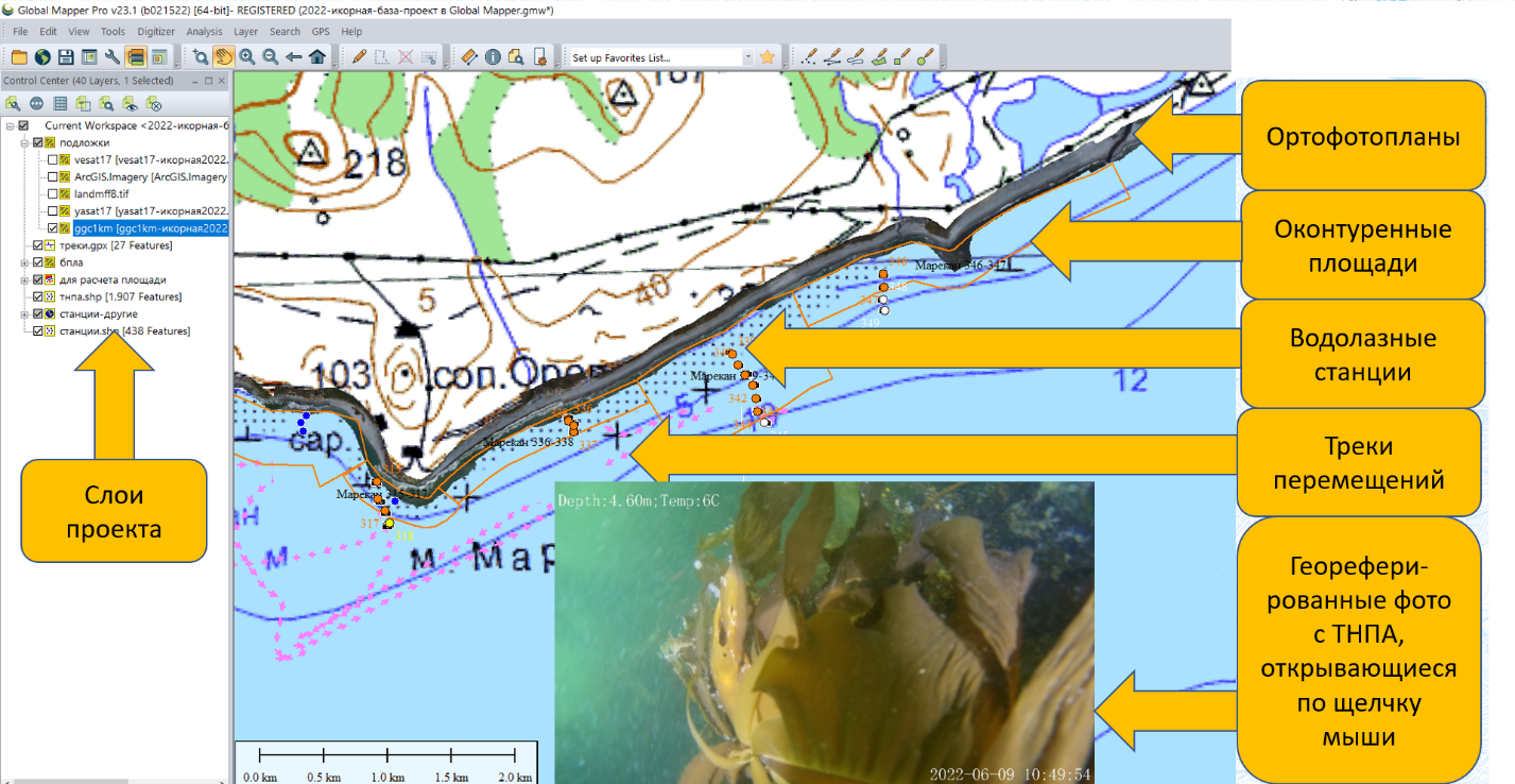 Для ориентирования на местности использовали мобильную геоинформационную систему AlpineQuest, в которой записывали треки передвижений, координаты и характеристики станций. Атрибутивные данные съемок, подводные фотоснимки, ортофотопланы (т.е. цифровые фотомозаики местности), растровые топографические карты и космоснимки загружали в настольную геоинформационную систему Global Mapper, создавая «цифровые двойники» (Blair, 2021; Nativi et al., 2021) экосистем: многослойные интерактивные иллюстрированные карты района съемки, содержащие в виде слоев бóльшую часть ее результатов (рис. 3) и пригодные для планирования исследований, систематизации, обработки и представления данных. Их создание обеспечивало максимальную степень верифицируемости получаемых результатов.