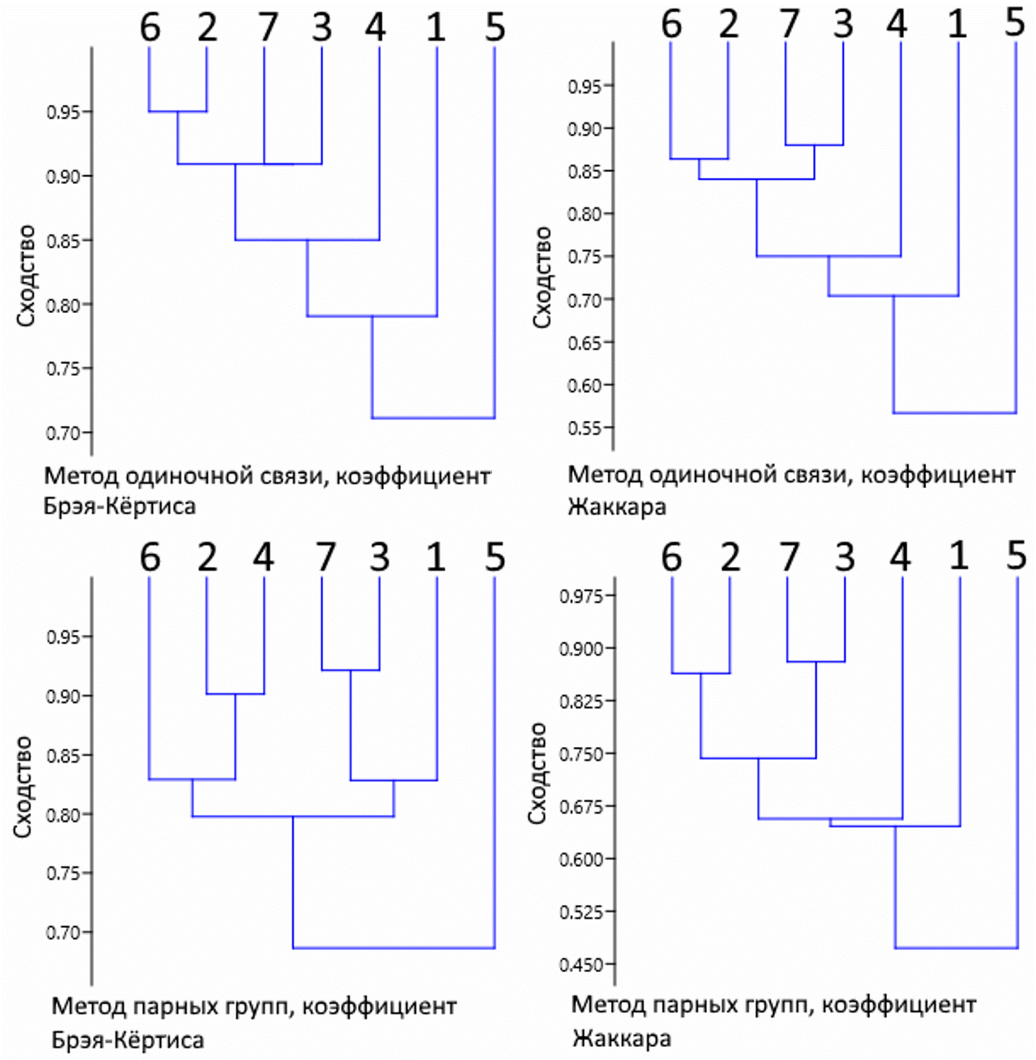 Рис. 4. Уровень сходства состава доминантов сублиторальной растительности у северо-западного побережья Японского моря, выделенных различными способами. Цифровые обозначения см. в табл. 1