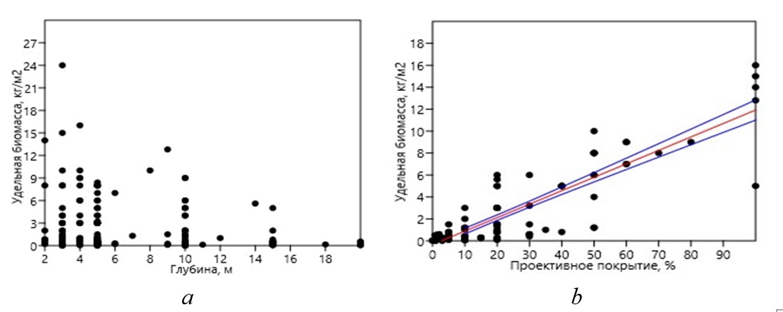 Рис. 5. Распределение удельной биомассы сахарины японской по глубинам (a) и ее зависимость от проективного покрытия, с линией регрессии и 95% доверительными границами (b)