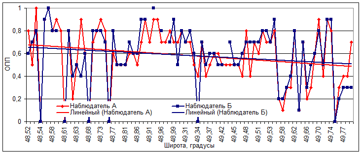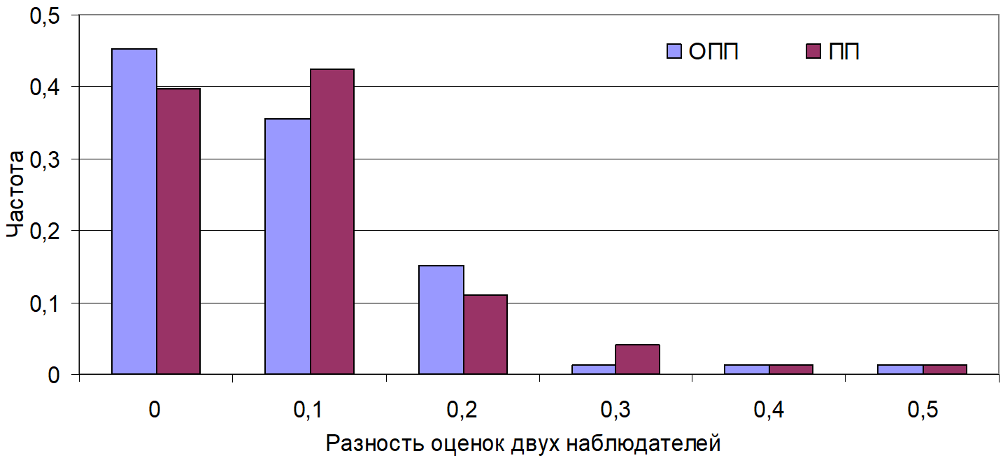 Fig. 6. Visual assessments of total bottom vegetation cover by two observers off the northwestern Sea of Japan coast (ОПП – total projective coverage)