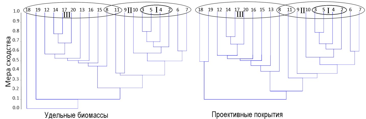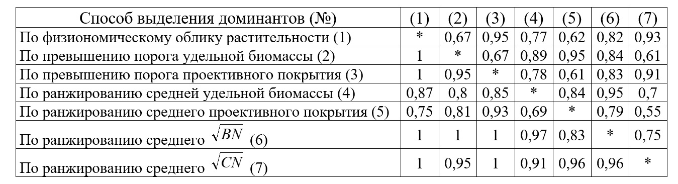 Результаты кластерного анализа (рис. 4) показали согласованную картину: уровни сходства большинства списков доминантов высоки. Таким образом, адекватность оценок доминирования верифицируется различными способами выделения доминантов, основанными как на субъективных визуальных оценках, так и на инструментальном учете обилия. Визуально определяемые величины проективного покрытия принципиально пригодны для выделения доминантов. Однако очевидно, что 7 способов выделения доминантов для практики избыточны.