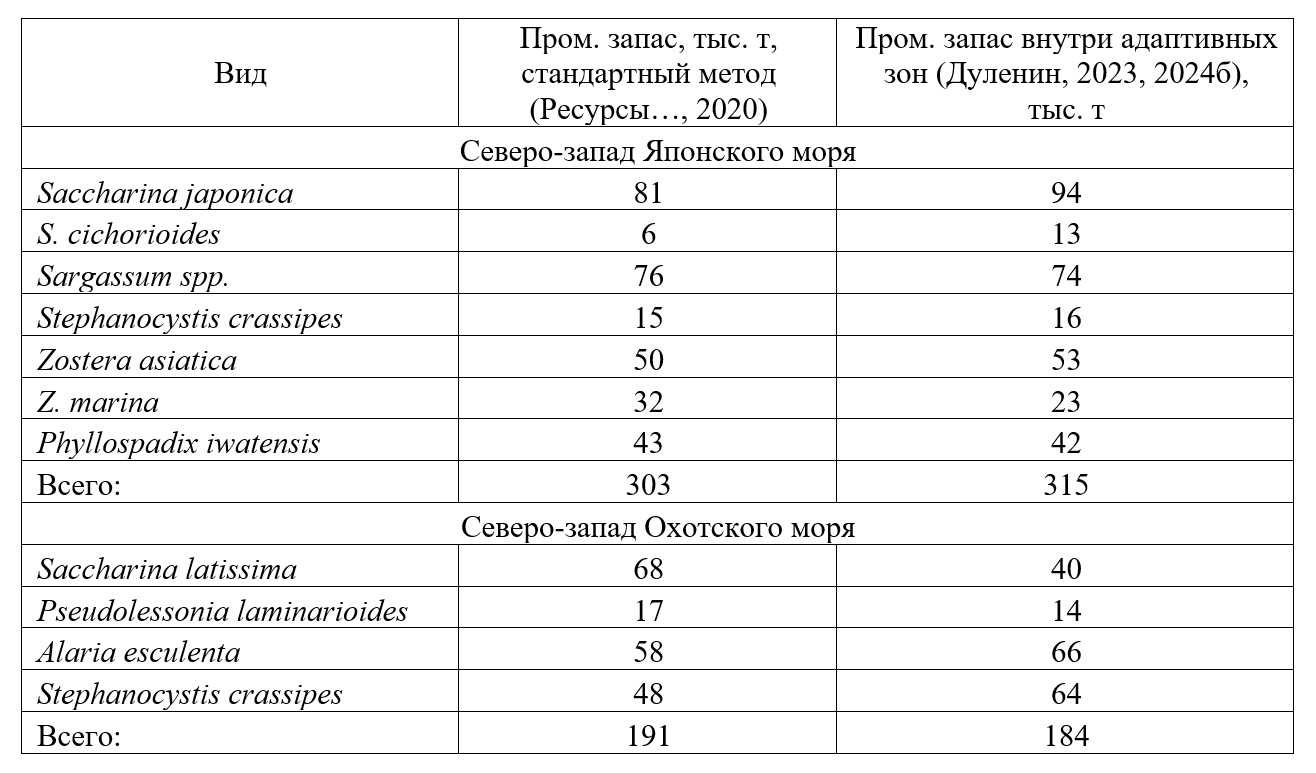 В качестве промысловых учтены поселения видов в пределах своих адаптивных зон (Дуленин, 2023, 2024б). Промысловые запасы рассчитывали, суммируя произведения площади и удельных биомасс видов на промысловых участках. Оценки запасов по результатам визуальных наблюдений выполняли по разработанным методикам (Дуленин, 2016а, 2020а) на основании сопоставления оценок покрытия дна растительностью, выполняемых одновременно и независимо двумя наблюдателями.
