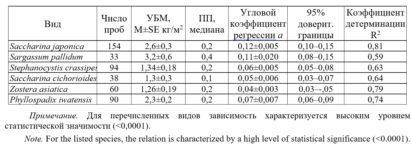 Таблица 2. Описательные статистики и показатели зависимости удельной биомассы (УБМ) и проективного покрытия (ПП) для макрофитов у северо-западного побережья Японского моря
