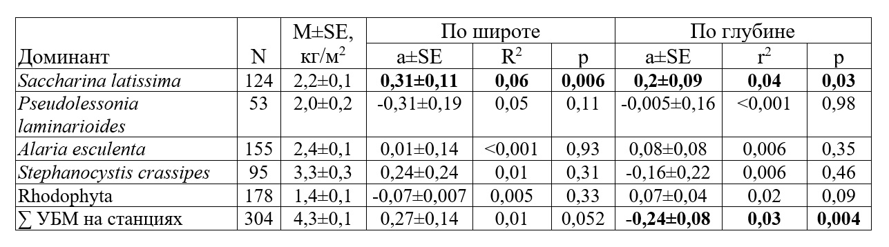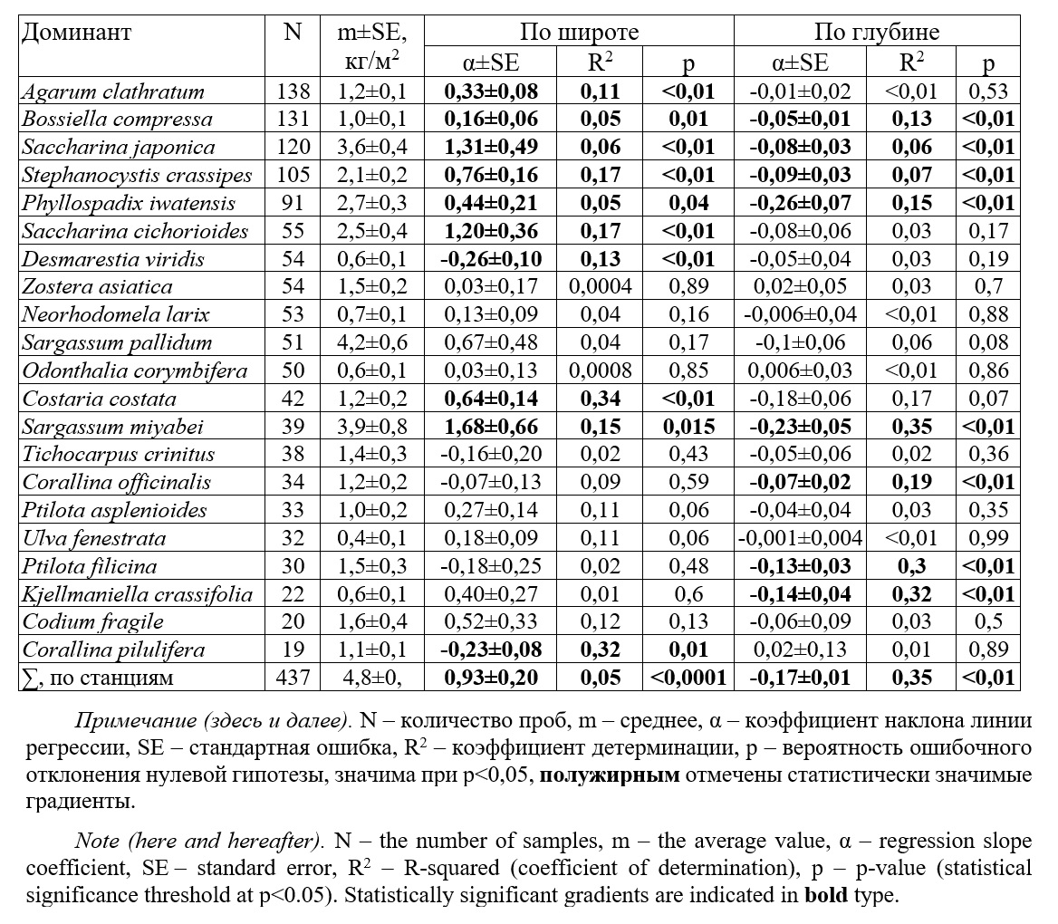 У северо-западного берега Японского моря на региональном инфраценотическом уровне состав и обилие доминантов меняются по широте и глубине (табл. 3, рис. 8).