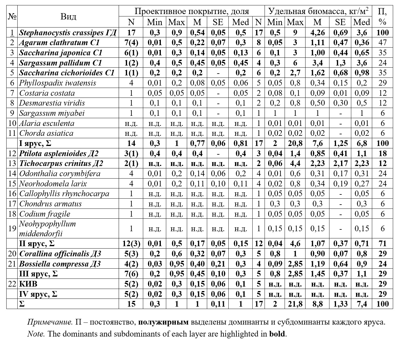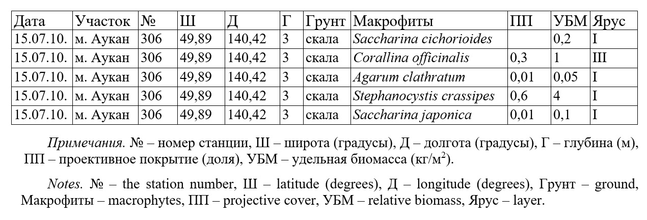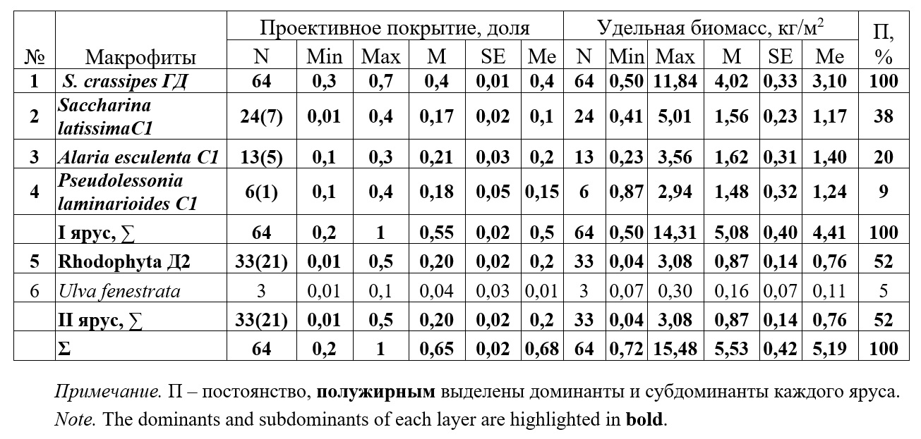Table 2. Descriptive statistics and relation indicators between specific biomass and projective cover for macrophytes off the northwest coast of the Sea of Japan