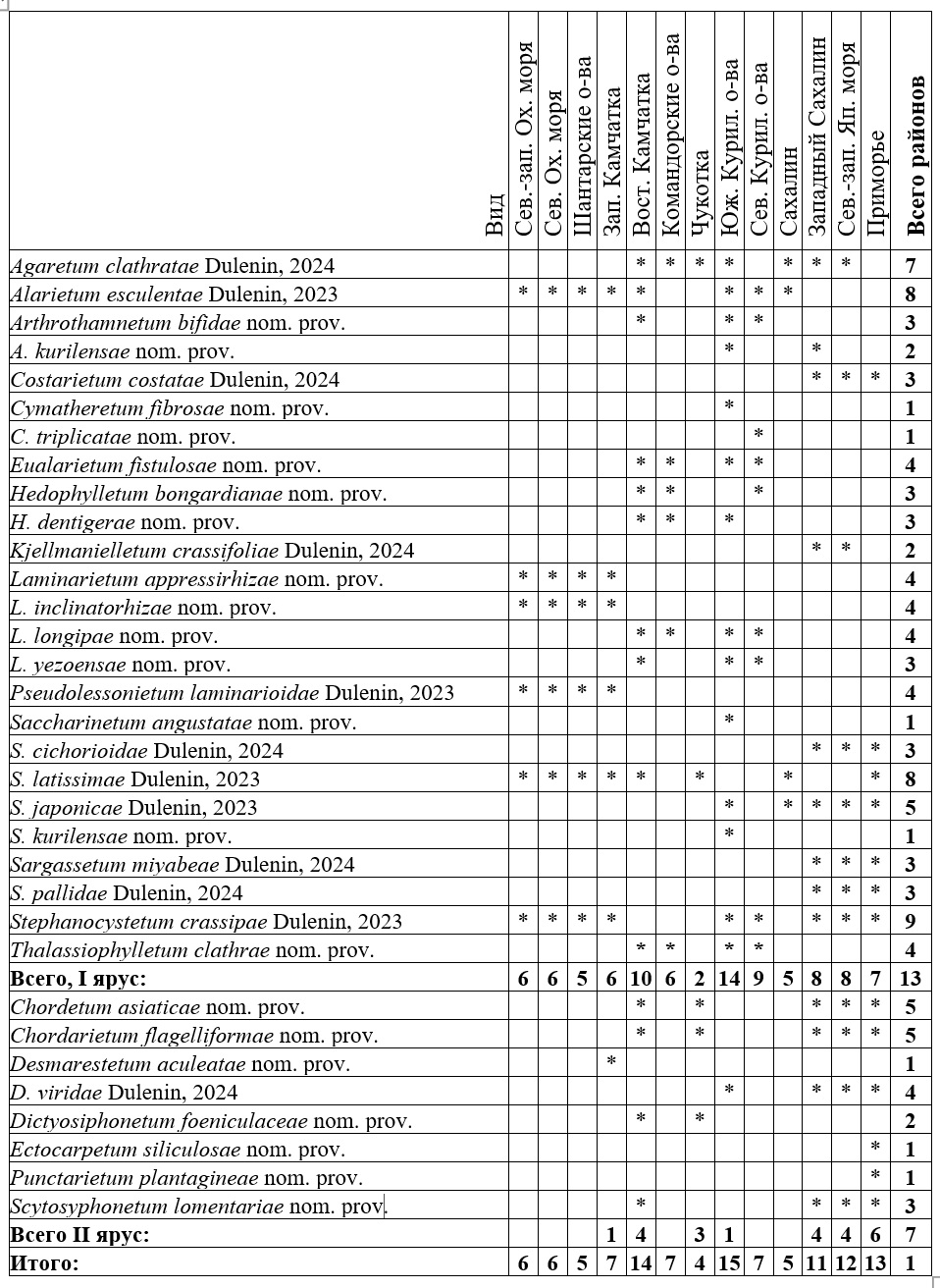 Настоящее сообщение представляет собой краткий обзор опыта автора по структурированию дальневосточной сублиторальной растительности, более полно изложенного в его докторской диссертации (Дуленин, 2024а). Необходимость в такой работе возникла в связи с тем, что Дальний Восток России – регион со слабо изученной сублиторальной растительностью. Ее сообщества описывали преимущественно на локальных участках Приморья (Скарлато и др., 1967; Калита, Скрипцова, 2014), на Курилах (Гусарова, 1975; Евсеева, 2007) и у берегов Сахалина (Голиков и др., 1985; Петров, Поздеев, 1992). Ряд публикаций имеют описательный характер и почти не содержат количественных характеристик растительности (Блинова, 1971; Перестенко, 1980, 1997). Обобщающие работы не имеют сведений о ценотической структуре растительного покрова (Гусарова и др., 1993) или носят компилятивный характер (Суховеева, Подкорытова, 2006; Блинова, 2014; Ресурсы …, 2020). Систематические обобщения, в которых содержались бы единообразные ценологические характеристики сублиторальной морской дальневосточной растительности, до сих пор отсутствуют.