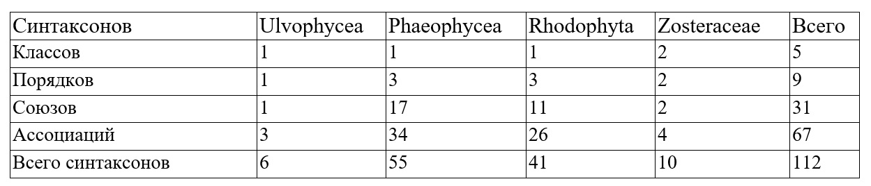 Проблемой является принципиальная возможность приведения к «общему знаменателю» разнородных количественных и качественных описаний растительности, поскольку методические и методологические подходы к ее описанию разнятся, а данные, полученные разными исследователями, нередко представляются несопоставимыми (Афанасьев, Рубан, 2013; Дуленин, 2023). Общая синтаксономическая классификация сублиторальной растительности дальневосточных морей России до сих пор не было разработана.